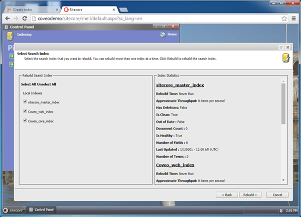 When the indexing process completes, go back to the tab in your browser that opened after you installed CES7 and refresh. It will take you to the Coveo Enterprise Search Admin interface. Click on the Content tab and expand the Local Index. You should see the three indexes you rebuilt via the Indexing Manager.